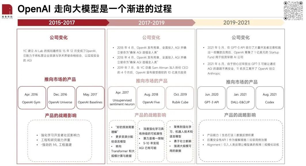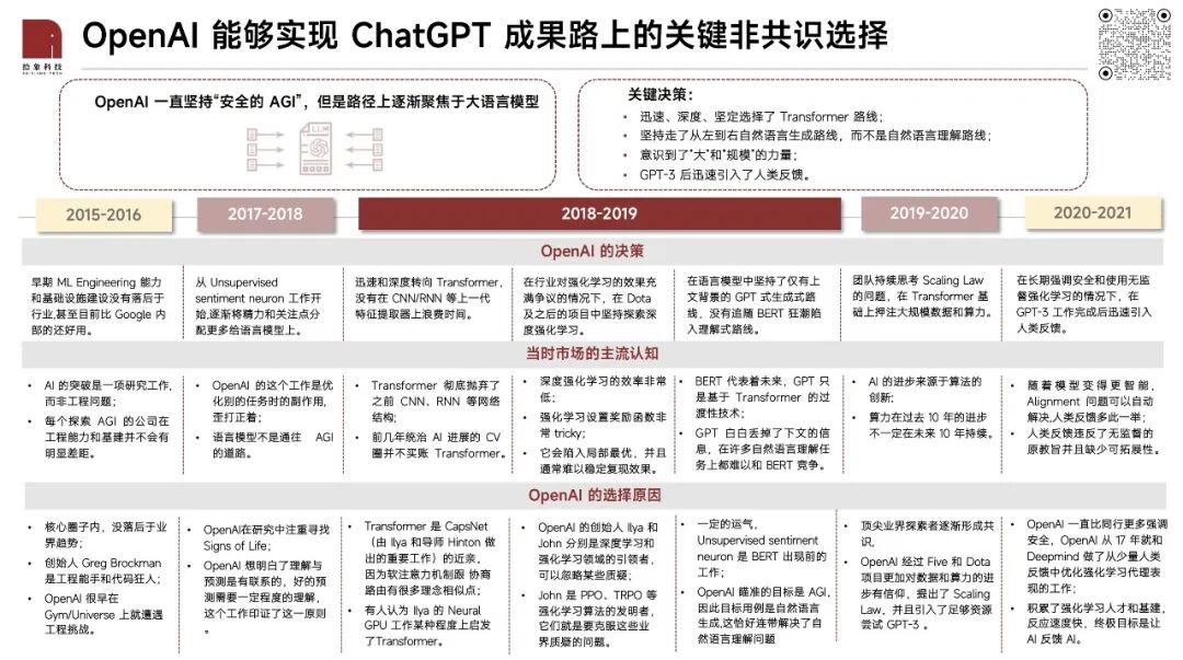 除了沿着历史发展脉络来看 OpenAI 的演进,我们还可以反过来看,OpenAI 在这个过程中做了什么非共识或者超过对手的选择。