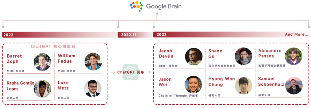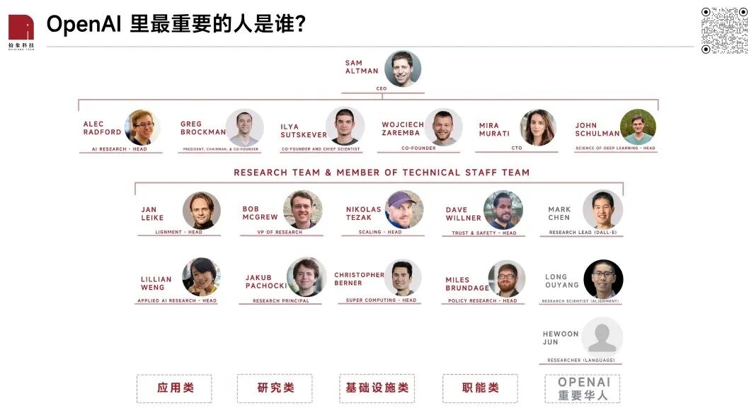 OpenAI 的几位 Co-founder 凑齐了业内最好的工程师+科学家+企业家,团队人才密度高,每个人都是六边形战士。从整体组织上看,基建部分的 scaling 团队和超算团队支持所有模型训练和应用团队。OpenAI 目前约有 400 人,此处列举在科学和工程方面最核心的几位: