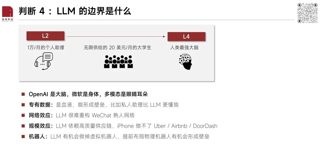 在当下的时点,我们可以把 LLM 的能力比作自动驾驶的 L2 —— 有一定的理解能力和执行能力,但仍旧需要具体的指令;在 4-5 年后,LLM 到了自己的 L4 阶段,不仅会获得主动解决问题的能力,也极有可能会超越人类最强大脑。