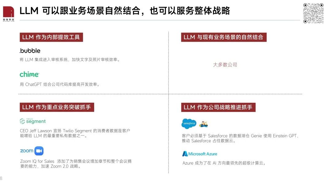 4. 通过 LLM 获得新的战略增长点:典型代表是微软 Azure 和 OpenAI 的结合。Salesforce 也是比较典型的实操案例。