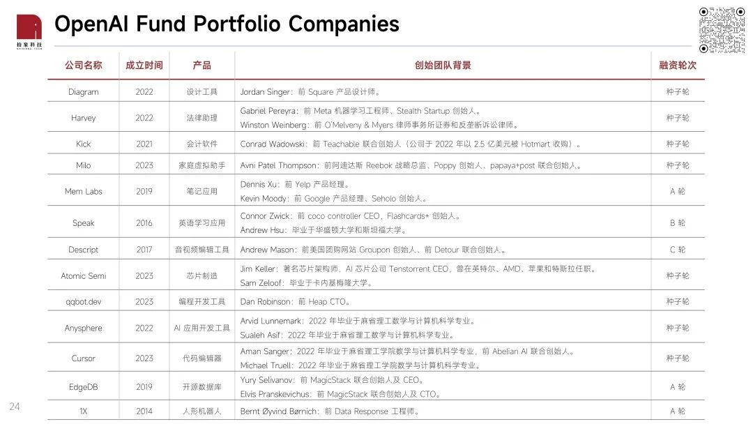 最后补充一个值得关注的方向,即 OpenAI Fund 投资的公司。一方面,我们可以通过 OpenAI 的投资布局推测未来大模型最有机会在哪些场景落地、以及不同场景的落地节奏;另一方面,在 OpenAI 的 Portfolio 公司中,几乎每家公司都有非常具体的场景,而不只是工具的形态。因此我们认为 OpenAI 的投资标的非常值得关注。