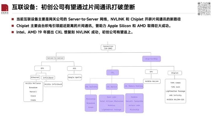 互联设备可以分为 Server-to-Server 和 Chip-to-Chip,Server-to-Server 已经被传统网关公司和 NVIDIA 垄断了,Chip-to-Chip 环节还存在有一些初创公司的机会,并且技术成熟度较高,预计 25-27 年会在数据中心推广开。