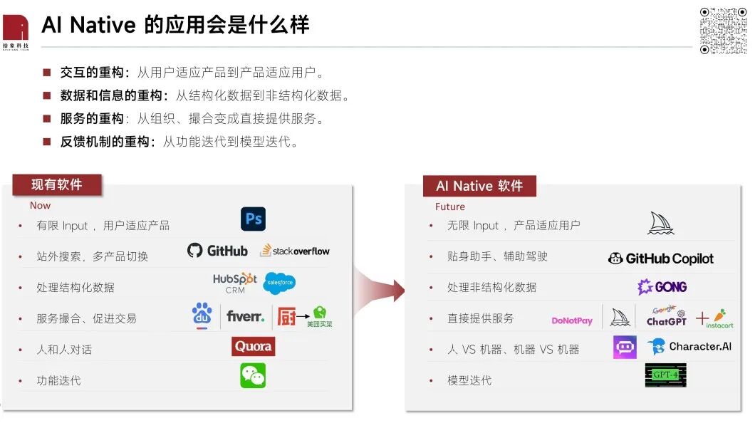 现阶段我们很难精确定义未来的 AI Native 应用会长什么样,这里提供一些观察视角。我们认为 AI Native 不能只是语言模型的嵌套,而是对现有软件服务的重构: