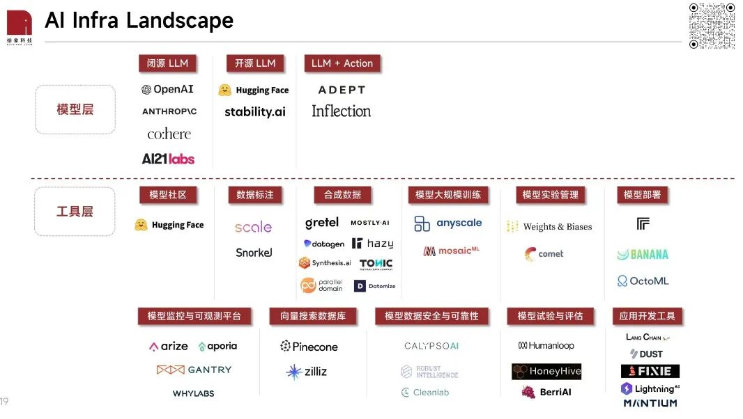 AI Infra 主要分为模型层和工具层:模型包括开源、闭源以及从模型到应用的端到端的公司;工具层主要围绕着模型训练和模型推理两大板块 mapping 了各个细分环节。