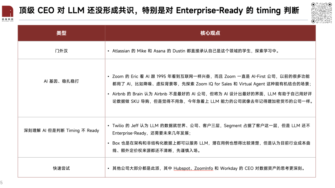 二级公司整体在等未来 6-8 个月的窗口期,在今年下半年来验证目前的集成项目是否能从客户增长、订价保护等层面获得更反馈。微软和 Google 投了 AI research 的公司之外,大部分二级市场科技公司几乎没有在 LLM 进行提前投入,所以基本上大家都在统一起跑线上。