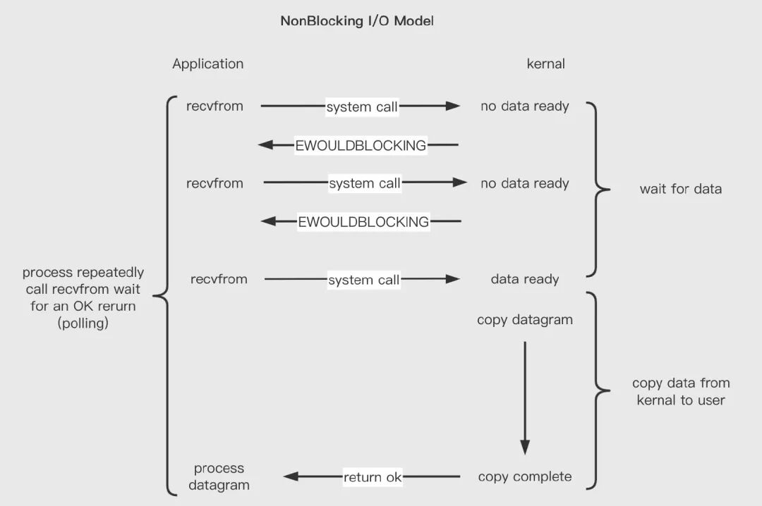 非阻塞 IO :在第一阶段(网卡-内核态)数据未到达时不等待,然后直接返回。数据就绪后,从内核态拷贝到用户态再返回。