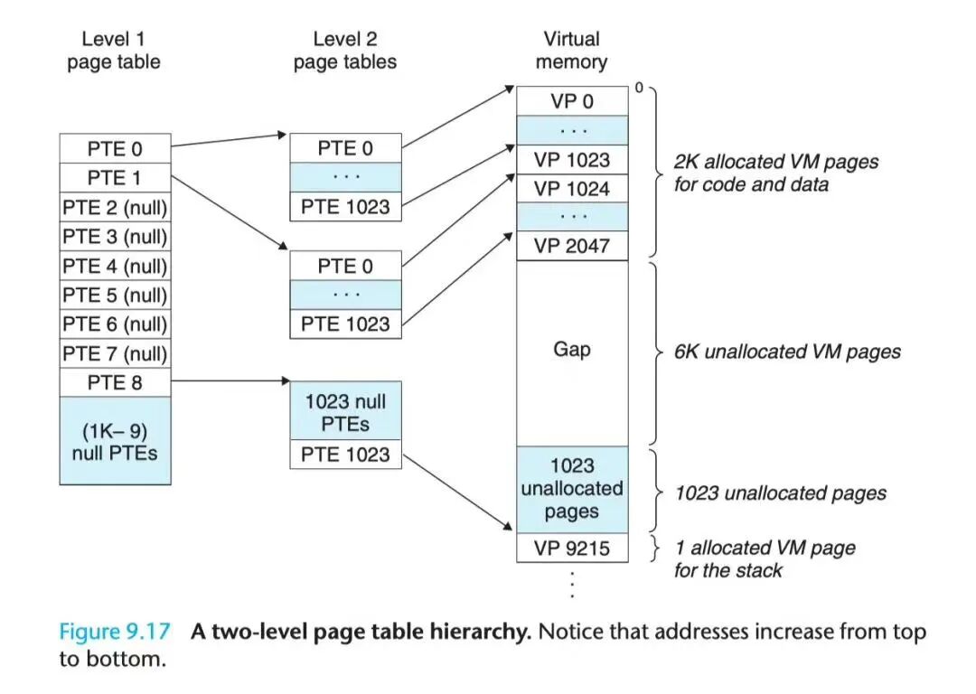 多级页表的关键在于,我们并不需要为一级页表中的每一个 PTE 都分配一个二级页表,而只需要为进程当前使用到的地址做相应的分配和映射。因此,对于大部分进程来说,它们的一级页表中有大量空置的 PTE,那么这部分 PTE 对应的二级页表也将无需存在,这是一个相当可观的内存节约,事实上对于一个典型的程序来说,理论上的 4GB 可用虚拟内存地址空间绝大部分都会处于这样一种未分配的状态;更进一步,在程序运行过程中,只需要把一级页表放在主存中,虚拟内存系统可以在实际需要的时候才去创建、调入和调出二级页表,这样就可以确保只有那些最频繁被使用的二级页表才会常驻在主存中,此举亦极大地缓解了主存的压力。