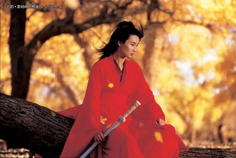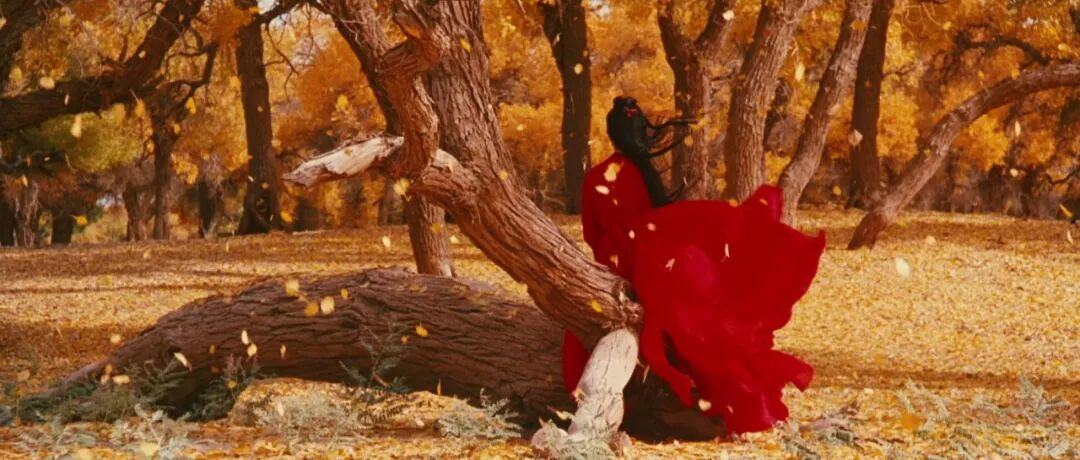 《英雄》中两位红衣佳人在漫天飞叶中决斗,为一个男人生死相搏。该场景正是拍摄于阿拉善盟额济纳旗胡杨林。