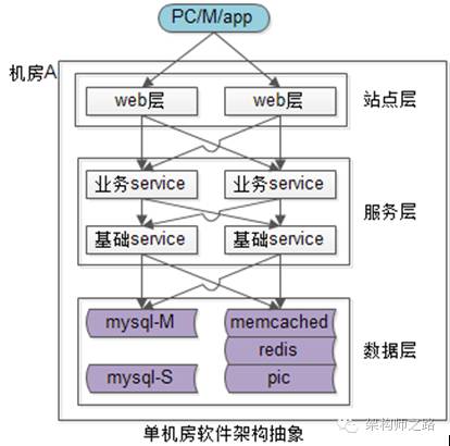 该单机房分层架构,所有的应用、服务、数据是部署在同一个机房,其架构特点是“全连接”: