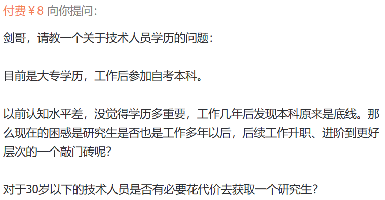 之前分享过很多技术方案,每次我都会说,“为什么”比“怎么样”更重要。各大公司可能都有自己的标准,但学历一定不是最主要的因素。在我的团队,这一项甚至不是准入因素,招聘和晋升都不看学历。(1)提升自己技术能力,业务能力,通用能力(沟通能力,表达能力,学习能力等等);画外音:大部分公司,升职加薪看能力,态度,业绩产出。那在职研也未必是最佳的方式,选择EMBA,或者更高端的一些圈子,可能是更好的选择。总之,明确了自己的目标之后,找到达成目标的多种方法,并选择最合适自己,ROI最佳的方法。企业招聘校招生时,会看学校,学历,专业,权重还不低。重点高校有差学生,非重点高校有好学生,这是赤果果的歧视吗?完全不存在任何“歧视”和“不公平”,这是一个关于招聘投入产出比,关于招聘效率,关于招聘风险概率的问题。一个企业假设一年要招50个毕业生,去10个城市,每个城市只招5个毕业生,但这个城市可能有500个毕业生投递简历,你说用人单位怎么选?用人单位会认为:(1)985或者211,相比非211,毕业生优秀的概率会更大一些;(2)研究生,相比本科生,学习实践的时间更长,熟练的概率会更大一些;(3)相关专业,相比非相关专业,特别是技术类的,基本功好的概率会更大一些;有学历疑问,在犹豫是否要读在职研的朋友,没人能帮你做决策,但我建议是:专注于提升能力,端正态度,持续拿到高绩效,比读在职研,晋升跳槽成功的概率更大。