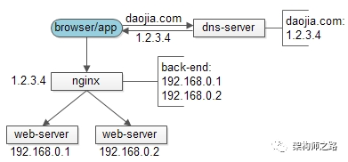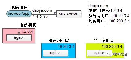 (1)客户端请求dns-server,发起域名解析;(2)dns-server返回域名对应的外网ip(1.2.3.4);(3)客户端通过外网ip(1.2.3.4),访问反向代理;(4)反向代理通过内网ip(192.168.x.x),将请求分发给web-server;其中,第一个步骤,将域名转化ip的过程,发生在应用系统的外部,是通过DNS实现的。除了域名解析,在架构设计时,还能利用DNS做一些什么事情呢?(2)浏览器向dns-server发起域名解析请求;(3)dns-server识别出访问者是电信用户;(4)dns-server将电信机房的nginx外网ip返回给访问者;根据用户ip来返回最近的服务器ip,称为“智能DNS”,CDN以及多机房多活中最常用。典型的互联网架构中,可以通过增加web-server来扩充web层的性能,但反向代理nginx仍是整个系统的唯一入口,如果系统吞吐超过nginx的性能极限,难以扩容,此时就需要dns-server来配合水平扩展。具体做法是:在dns-server对于同一个域名可以配置多个nginx的外网ip,每次DNS解析请求,轮询返回不同的ip,这样就能实现nginx的水平扩展,这个方法叫“DNS轮询”。既然“dns轮询”可以将同一个域名的流量均匀分配到不同的nginx,那么也可以利用它来做web-server的负载均衡:(2)将多个web-server的内网ip直接改为外网ip;(3)在dns-server将域名对应的外网ip进行轮询解析;(1)DNS只具备解析功能,不能保证对应外网ip的可用性,而nginx做反向代理时,与web-server之间有保活探测机制,当web-server挂掉时,能够自动迁移流量;(2)当web-server需要扩容时,通过DNS扩容生效时间长,而nginx是服务端完全自己可控的部分,web-server扩容更实时更方便;因为上面两个原因,架构上一般都使用高可用反向代理。