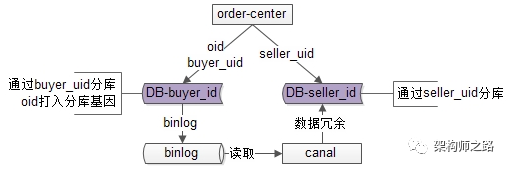(1)如果没有seller_uid,“多key”业务会蜕化为“1对多”业务,此时应该使用“基因法”分库:使用buyer_uid分库,在oid中加入分库基因;