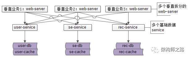 于是系统架构变成了上图这个样子,业务垂直拆分,有若干个基础数据服务: