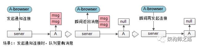 上面三个场景的最终状态,都是“一定,永远,会有一条通知连接,连接在浏览器与服务器之间”,这样就能够保证消息的实时性。当然,有人会说,HTTP的返回与再次发起会有一个时间差,如果这个时间差,恰巧有新消息过来呢?