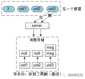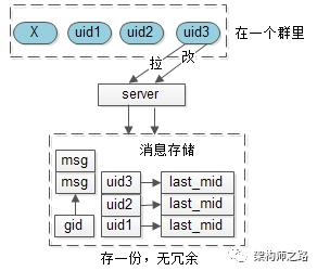 即,群消息只存储一份,群友无需冗余任何消息实体,或者消息ID了。