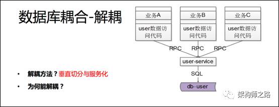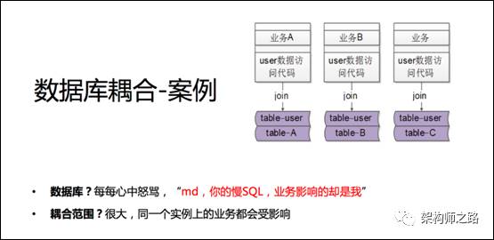 耦合,是架构中,本来不相干的代码、模块、服务、系统因为某些原因联系在一起,各自独立性差,影响则相互影响,变动则相互变动的一种架构状态。作为技术人,每每在心中骂上下游,骂兄弟部门,“这个东西跟我有什么关系?为什么需要我来配合做这个事情?”。明明不应该联动,却要被动配合,就可能有潜在的耦合。但如果服务化不合理,将部分个性化业务下沉到了底层,就是一个耦合的典型案例。业务1,业务2,业务3,因为join导致数据库实例耦合在了一起。为了实现通用数据库table-user的解耦,实施了服务化,将通用user数据的访问抽象出了服务。由于服务化不合理,会有很少很少的个性化业务逻辑,实现在底层的服务中,典型的伪代码是:switch(biz_type){