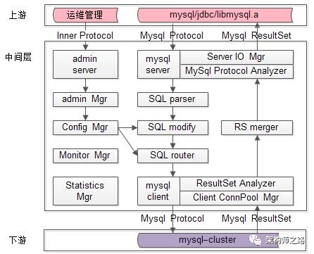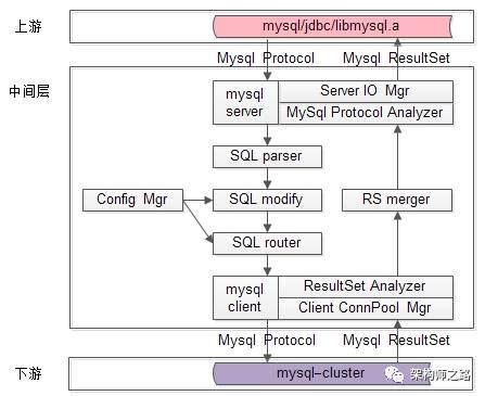 however,只要总的框架设计具备可扩展性,这些功能可以循序渐进,逐步添加。既然选择了mysql client server protocol作为业务层与中间层之间的协议,那么中间层必然是作为mysql-server接收上游的请求,作为mysql-client向真正的mysql发送请求的,中间层的整体结构如下:这样的话,需要对mysql client server protocol做详尽的研究,了解:协议这一块的掌握必须详尽,好在官方文档相对比较全面:http://dev.mysql.com/doc/internals/en/client-server-protocol.html - mysql客户端,java使用jdbc作为上游连接,c/c++使用libmysql.a作为上游连接,使用的是Mysql Client Server协议 - DBA亦可以向中间件发送一些管理命令,或者查看一些统计信息,使用的是自己定义的内部协议处于系统体系结构中的最后端,系统中间件的下游就是mysql集群了,中间件与mysql之间使用的也是Mysql Client Server协议。中间层配置文件管理组件ConfigMgr是中间层中非常重要的一个部分,请求的转发,读写分离,分库功能的支持,都需要通过配置来完成。<mysql>
