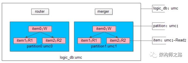 配置的含义是,上游如果访问逻辑数据库logic_db=”im”,中间件则将请求转发到实际的后端数据库item,item中配置了后端数据库的ip/port/name。解释分库支持的配置之前,先说明一下数据库的层次结构LOGIC_DB、PARTITION、ITEM。LOGIC_DB:逻辑数据库,面向上游,例如umcPARTITION:数据库分区,可以理解为分库,例如umc0和umc1,这个对上游是透明的ITEM:数据库项,可以理解为一个分区上的一个读库或者写库,这个对上游也是透明的<db id=1 logic_db="umc"type=2 patition_count=2 key="uid" hash="mod">