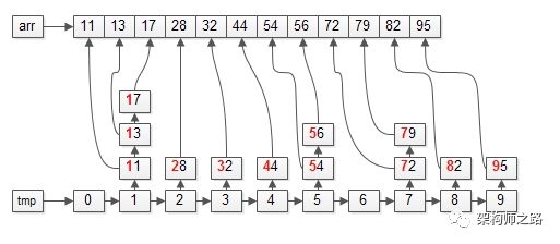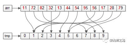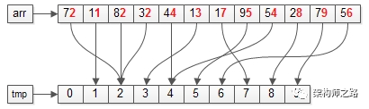 画外音:居然还有时间复杂度为O(n)的排序算法?不但有,其实还有很多。假设待排序的数组arr={72, 11, 82, 32, 44, 13, 17, 95, 54, 28, 79, 56}(1)基:被排序的元素的“个位”“十位”“百位”,暂且叫“基”,栗子中“基”的个数是2(个位和十位);(2)桶:“基”的每一位,都有一个取值范围,栗子中“基”的取值范围是0-9共10种,所以需要10个桶(bucket),来存放被排序的元素;FOR (每一个基) {