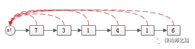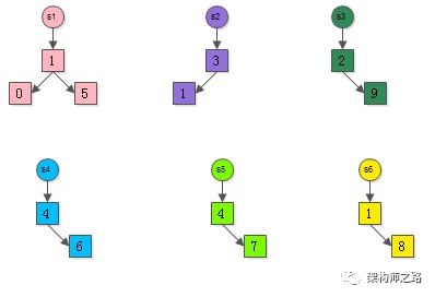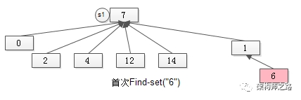 但为了让未来“通过元素6来找新S1的句柄”的操作能够在O(1)的时间内完成,在首次进行Find-set(“6”)时,就要将元素6“寻根”路径上的所有元素,都指向集合句柄,如下图。