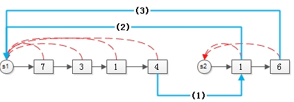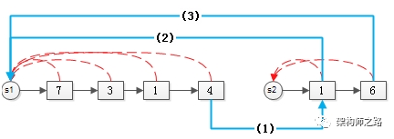 (1) 第一个集合的尾元素,链向第二个集合的头元素(蓝线1);