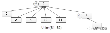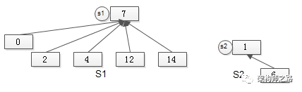 如上图所示,S2的句柄,指向S1的句柄,集合合并完成:S2消亡,S1变为了更大的集合。