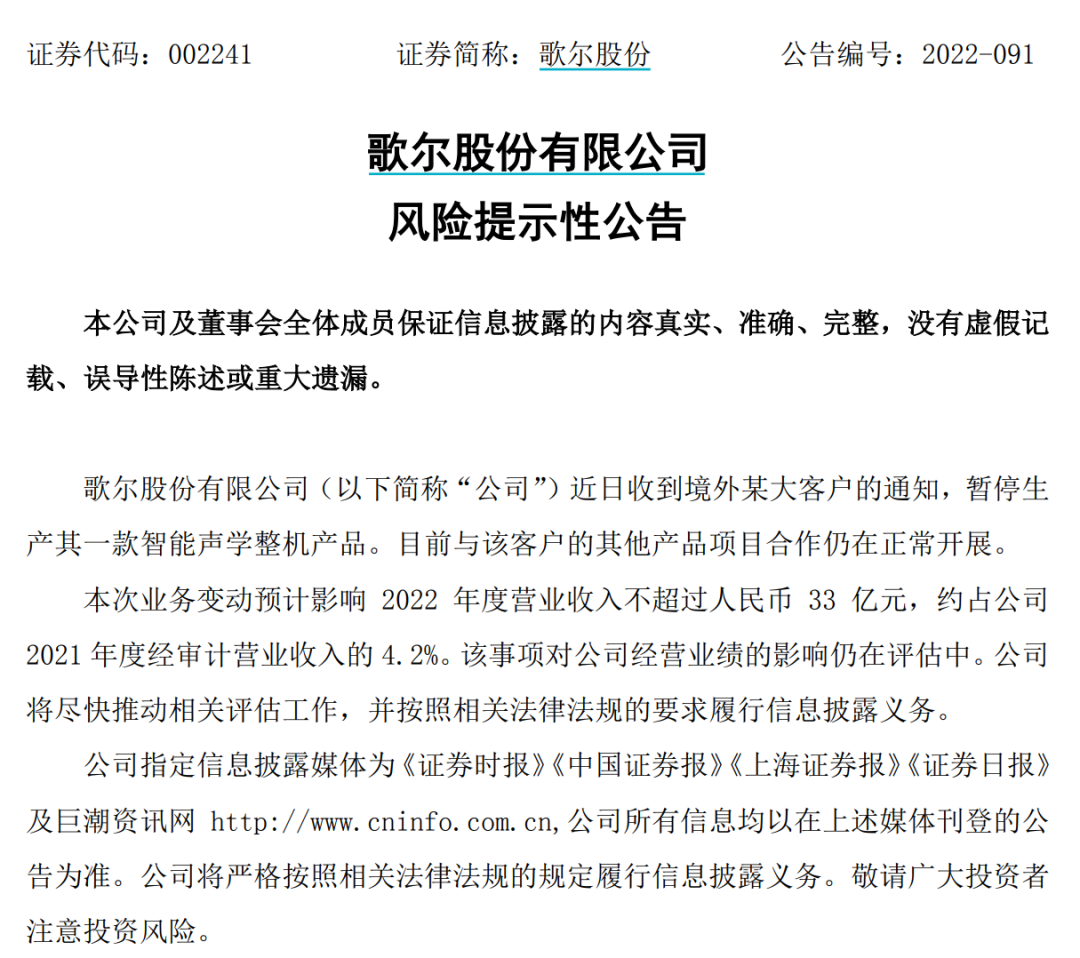 11月8日晚间,歌尔股份披露称,公司近日收到境外某大客户的通知,暂停生产其一款智能声学整机产品。针对该事件对于歌尔股份可能带来的损失,歌尔发布的风险提示性公告称,“本次业务变动预计影响2022年度营业收入不超过人民币33亿元,约占公司2021年度经审计营业收入的4.2%。目前与该客户的其他产品项目合作仍在正常开展。该事项对公司经营业绩的影响仍在评估中。”歌尔股份称。虽然歌尔股份并未透露该“境外某大客户”究竟是谁,被暂停生产的“一款智能声学整机产品”究竟是哪款产品,但是根据业内最新的爆料显示,这个境外大客户就是苹果公司,暂停生产的产品正是歌尔股份为苹果代工的耳机 AirPods2。公开资料也显示,歌尔股份是苹果AirPods产品零组件及整机主要供应商。另外,传闻还称歌尔股份被苹果要求暂停生产AirPods的原因是,苹果发现歌尔过去三年存在不良率造假问题。对此,苹果将对歌尔罚款十几亿元,目前苹果已经开始将AirPods订单转给了立讯精密。相关AirPods零组件订单则转给了AAC瑞声科技。不过,对此传闻,澎湃新闻援引知情人士的话报道称,“歌尔股份这次丢掉的订单为苹果耳机AirPods Pro,主要原因是良率不佳,但不存传闻中的良率造假,甚至被罚款等情况。”另据歌尔内部人士透露,“实际是生产管理上有些问题,但是只针对一个型号。目前该型号还在谈的过程中。其他的所有产品项目,无论是整机和零组件都还是在正常运转当中。不存在十几亿罚款问题。”天风国际分析师郭明錤也发文称,根据其调查,歌尔股份暂停生产可能是因为生产问题,而非需求问题。此前,有大量用户表示自己的Air Pods Pro 2出现了严重的“音频漂移”问题,音频无法与视频内容同步,有用户猜测可能是开启了空间音频和动态头部追踪功能才出现这种情况,但即便将其禁用,声音依然会在耳塞之间移动,还会自动增加音量。针对歌尔股份遭境外大客户“砍单”以及相关传闻,11月9日,公司相关负责人进行了回应:“踢出果链”等传言明显是谣传,公司只是应需求暂停客户一款产品,其余的项目都在正常合作。包括罚款多少亿的传闻,都是不实信息,公司还在评估具体损失,会及时公告。![]()