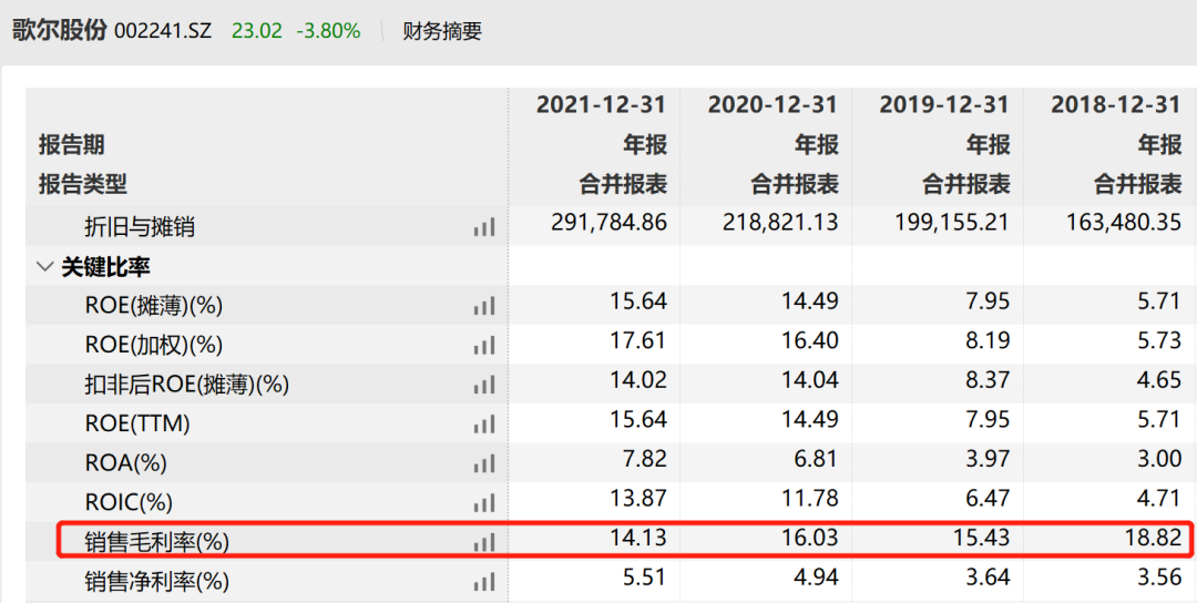 2021年年报数据显示,歌尔股份的销售毛利率从2018年的18.82%下降到了14.13%。