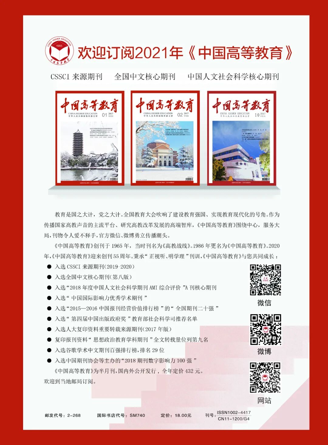 功能介绍 《中国高等教育》作为中华人民共和国教育部创办并主管的期刊,注重权威解读和方向引领,素有“高教第一刊”美誉。刊物始终坚持正确的舆论导向和学术导向,关注高教重点、难点、热点问题,是高教领域理论探究和工作交流的高端平台。