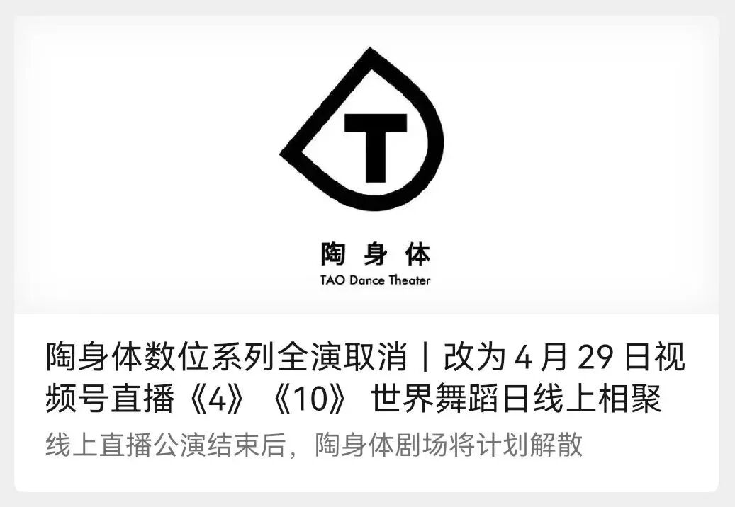 4月28日,“陶身体剧场”宣布:由于疫情影响,陶身体剧场于2021年底开始负运营。创始人陶冶说,以舞团现在的生存现状,5月过后将无力承担团员工资等运营成本,因此不得不计划解散。