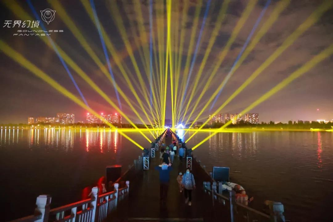 项目介绍:《无界·幻境》国际光影主题公园坐落于河北正定滹沱河艺术生态岛,占地约90000平方米,由“1光途-2破晓-3暮光-4初生-5秩序-6光的诗歌-7星晖-8夜鸣-9森灵-10幻境-11无界-12万象再生”12大主题沉浸光影艺术空间构成,在设计上借景构景,通过灯光、投影、原创音乐、互动装置、声光装置、3Dmapping等现代数字科技,对现有园林景观进行投影映射改造,把智能科技融入自然。公园打造了集休闲、娱乐、餐饮、文化为一体的多元化消费场域。2021年开放以来,陆续植入了剧本杀、话剧、演艺、营地等多样互动体验内容,以光影+露营、光影+啤酒美食、光影+音乐、光影+活动的形式,为游客打造“行浸式夜游新体验”。