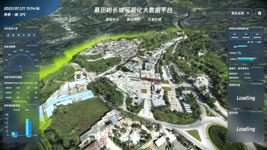 △图为慕田峪长城可视化数据分析平台,将票务、客流量、环境监测、车流状态等数据进行整合及可视化呈现,对慕田峪整体运行状态进行实时监测。