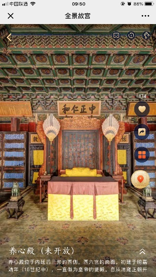 △图片依次为“全景故宫”移动端开屏画面、地图、养心殿外部及内部场景图