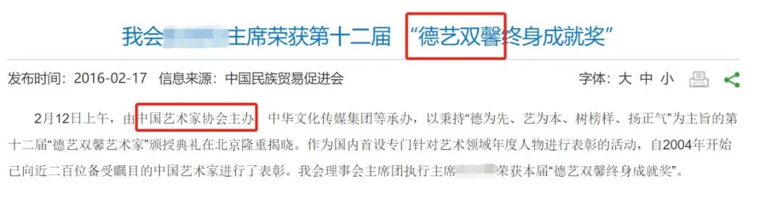 △这个据称举办了12届的“德艺双馨艺术家”评奖,主办单位中国艺术家协会于2016年被民政部发文认定为“山寨社团”