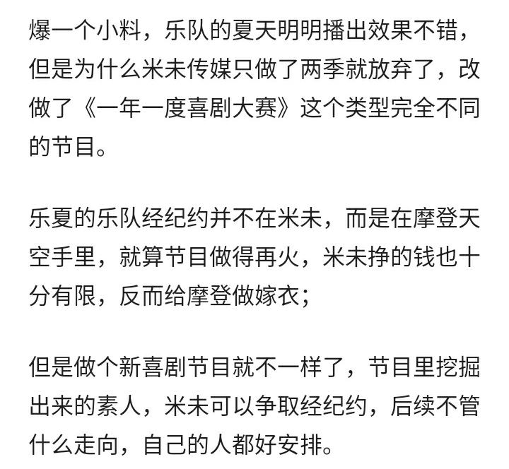 传闻称,米未传媒放弃了仅做了两季的《乐队的夏天》,改做《一年一度喜剧大赛》,是因为《乐队的夏天》给米未传媒带来的收益有限。对于网络综艺而言,曾经位于产业链条下游的网络视频平台逐渐向产业上游布局,结合网络综艺的变现模式,不管付费方是广告主还是用户,绝大多数收益是直接给到平台和提供艺人的经纪公司,而生产综艺内容的制作机构,其收益是间接获得的。对于米未传媒而言,做乐队节目和做喜剧节目最大的区别在于,相较签约乐队,米未传媒有更大机率从零开始孵化一批喜剧人才,在眼下越来越火的喜剧市场持续创收,从而更好地控制投入成本,借助节目引发的传播效应,获得长远回报。