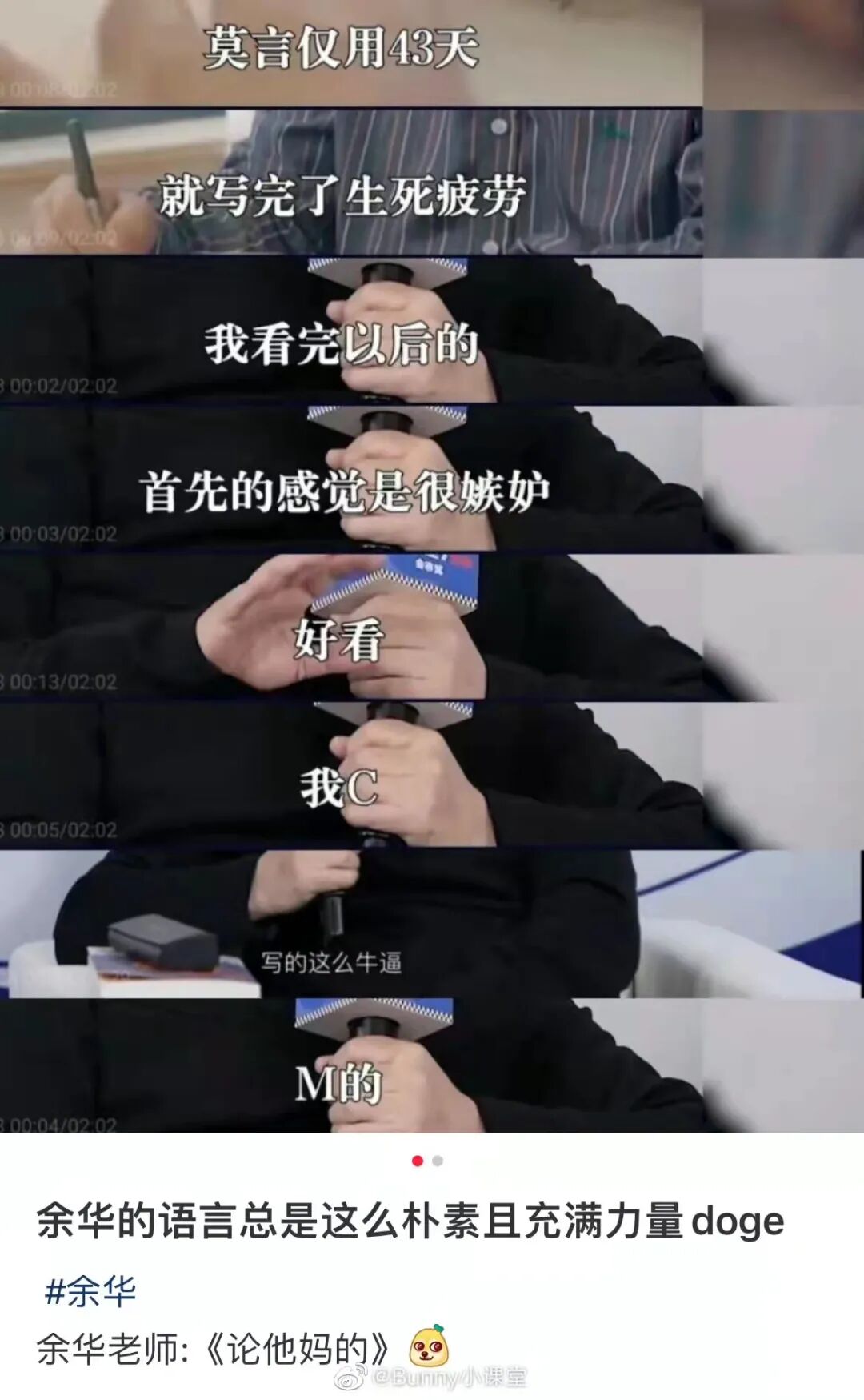 事实上,这已经不是余华贡献的第一个名场面了,几乎每个采访他都能“语出惊人”,逗乐观众。