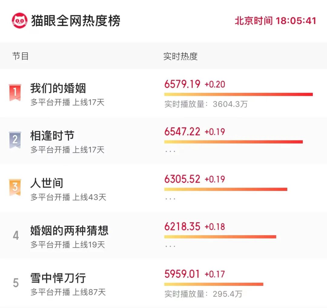 2022年2月,《我们的婚姻》《婚姻的两种猜想》两部聚焦“婚姻与职场”的都市情感剧同期播出,两剧热度都打入了猫眼电视剧全网热度榜前五,自播出以来,《我们的婚姻》在猫眼电视剧全网热度榜常居第一,《婚姻的两种猜想》位列第四位左右。在微博剧集话题中,#我们的婚姻#总阅读超6.2亿次,讨论次数高达56.7万次;#婚姻的两种猜想#总阅读超7.7亿次,讨论次数高达93.6万次。