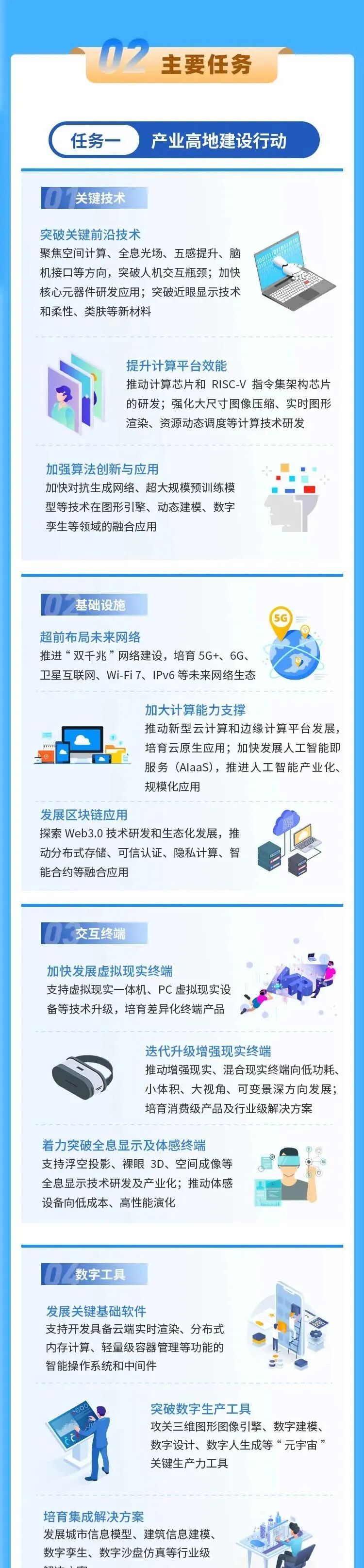 2.基础设施。超前布局未来网络,加快推进“双千兆”网络建设,培育5G+、6G、卫星互联网、Wi-Fi 7、IPv6等未来网络生态。加大计算能力支撑力度,推动云边一体布局、算力自由调配、云端实时渲染的新型云计算和边缘计算平台发展,培育基于容器化、开发运维一体化等技术的云原生应用。加快发展人工智能即服务,依托大规模公共算力集群建设,全面推进人工智能产业化、规模化应用。发展区块链应用,探索Web3.0技术研发和生态化发展,推动分布式存储、可信认证、隐私计算、智能合约等融合应用。