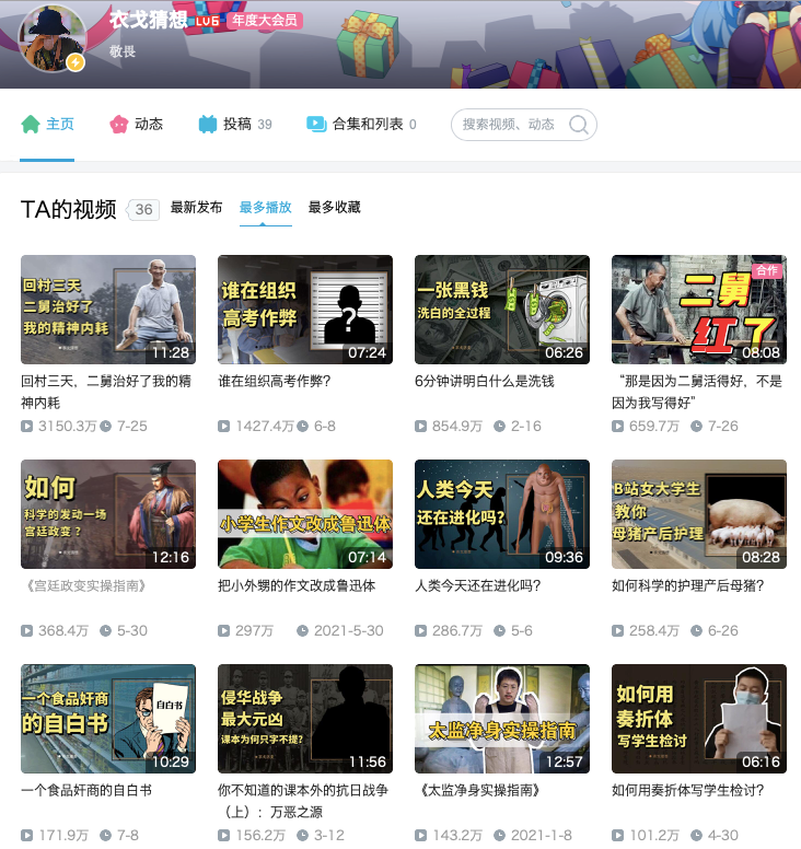 有过将近10年高中历史老师工作经验的衣戈,在《二舅》爆火出圈之前,就已经在B站小有名气,被平台认证为科普博主,制作过《谁在组织高考作弊》播放量超过1300万的视频,也制作过《6分钟讲明白什么是洗钱》《宫廷政变实操指南》《如何科学护理产后母猪》《太监净身实操指南》等播放量都在数百万以上的作品,但总体上来看,发布的内容不垂直,比较散,这其实是当下短视频创作者的大忌,会容易导致受众变得分散零碎。
