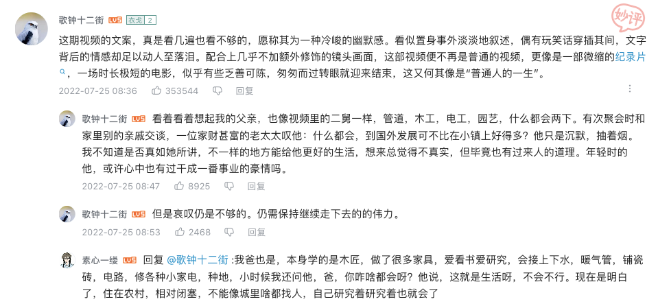从发布平台来看,选择在B站这个高流量的视频平台发布,并通过微博、朋友圈、小红书等外部平台进行裂变式传播,也是《二舅》视频走红的一大优势。