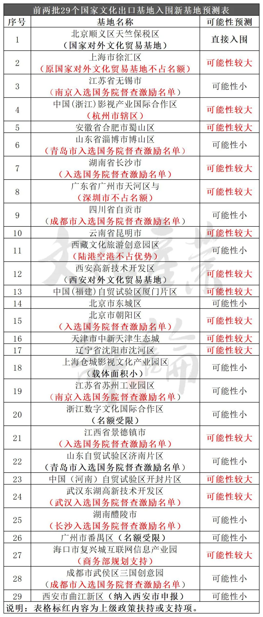 综合上述分析论证,依据申报条件中关键指标,参考国家级同类品牌创建惯例及做法,文化产业评论(ID:whcypl)研判预测,此次国家对外文化贸易基地申报认定,全国范围内有19个城市入围概率较大(未考虑省级政府及省级部门初审推荐时综合决策等不确定性因素)。