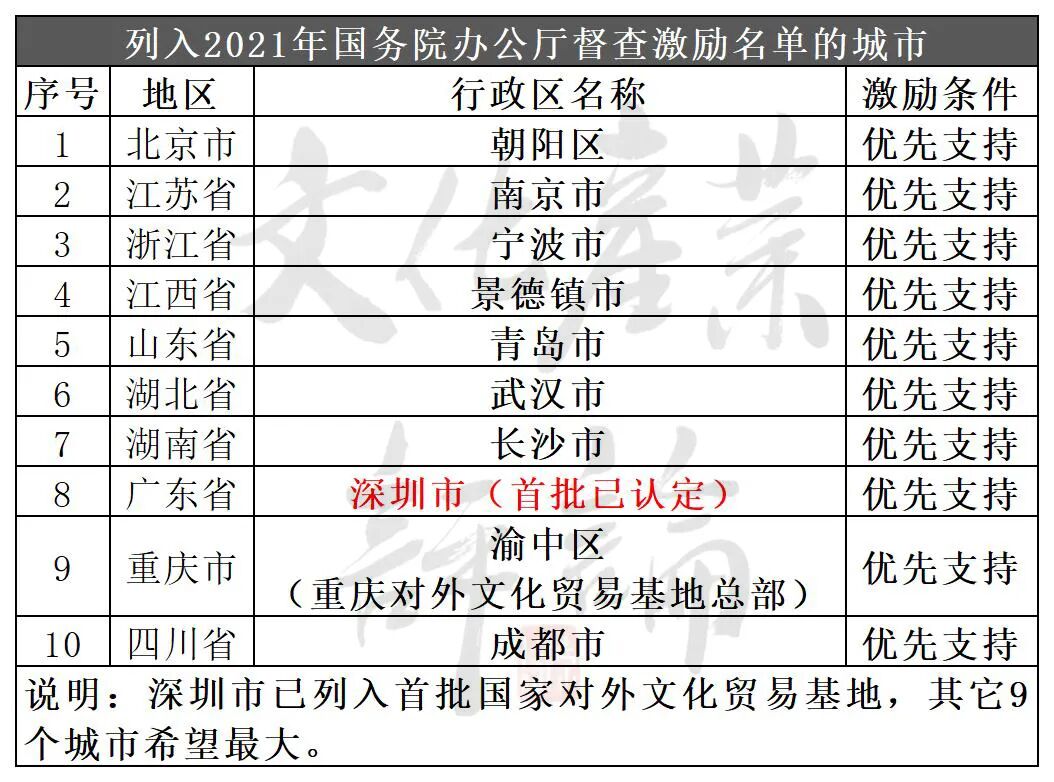 据文化产业评论(ID:whcypl)梳理,全国具备这项“优先支持”条件的城市共有10个,分别是北京市朝阳区、江苏省南京市、浙江省宁波市、江西省景德镇市、山东省青岛市、湖北省武汉市、湖南省长沙市、广东省深圳市、重庆市渝中区、四川省成都市。这也就是说,只要这10个城市同时具备的其他4个条件,有90%的入围胜算。