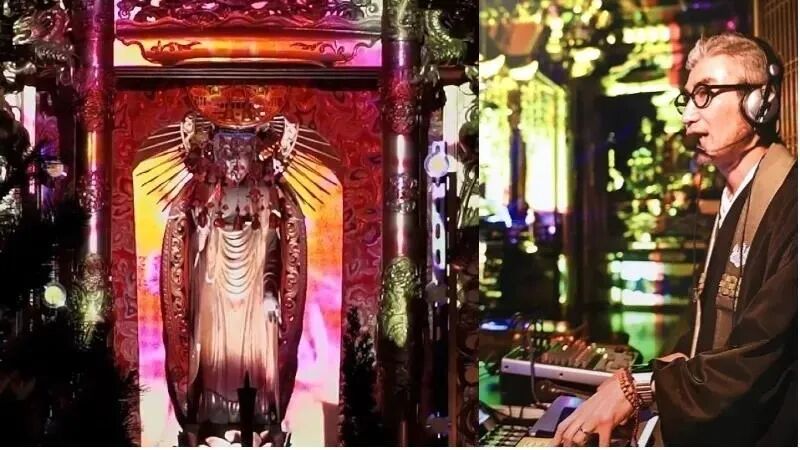 为了给佛教注入新活力,吸引更多年轻的信众,京都龙安寺曾在2018年举办过一场科技感极强的Remix风“电音法会”。现场绚烂的灯光、图像映照在佛堂中,庄严的佛像霎时五光十色,被效果器处理后的诵经声和电子音乐充斥耳畔。这场跨界的硬核蹦迪,让更多人看到了寺院为求生存、推广信仰的勇气和决心。