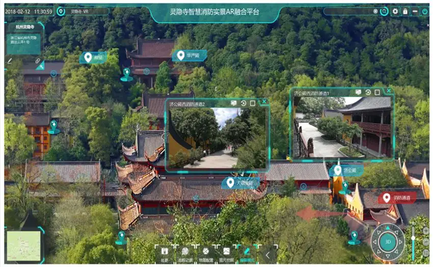 此外,针对灵隐寺作为国家重点文物保护单位、主体建筑又多为砖木结构的情况,该平台还完善了游客统计、防疫管控、数据安全、消防预警等细化功能;通过“GIS地图+VR场景+视频监控”虚实结合,对寺院内环境进行实时监测,提升事件研判能力和处置能力。