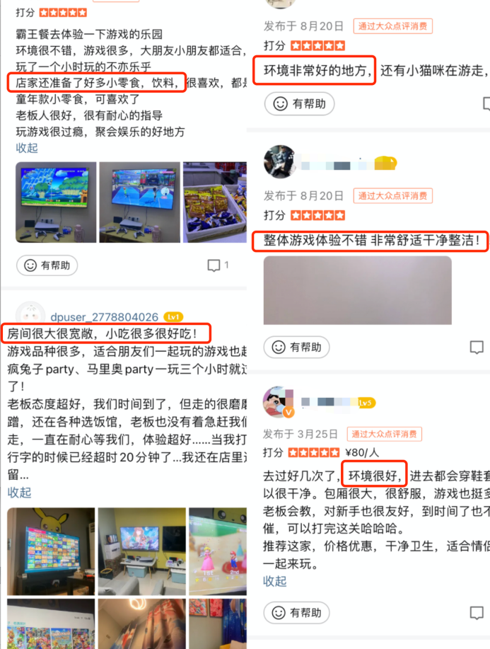 在B站和小红书上,许多店主用上了“推广”“科普”“教育”等词语,就像王者荣耀曾帮助大众了解MOBA类游戏,主机店的出现也帮助大众走入主机游戏的世界。打开点评软件的用户评论,比起店里是否有最新版的游戏,或游戏是否能联网,更常出现在评论中的是主题房的设计、服务质量、沙发舒适度、零食饮品的选择、环境卫生这些因素。