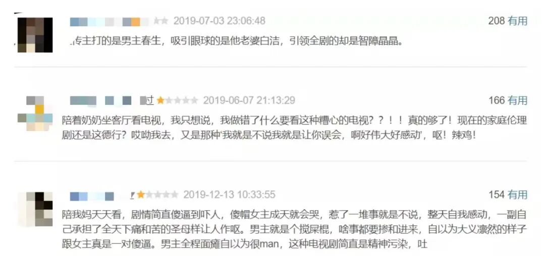 从豆瓣评论区的留言来看,为这些无人问津的2分剧打分的,都是在陪家里长辈在看剧的时候被气到的观众。在《我怕来不及》的豆瓣评论区,网友写道:“垃圾片可算完了,再也不用迁就我妈污染耳朵了”“心疼玩不来手机看不了网剧的老人家,每天眼睛都要被灌这种垃圾”。