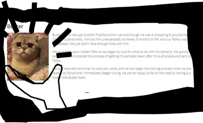 在上图的VIAGEN案例中,猫主人是在猫意外身亡后,在寻找宠物殡葬的有关信息时无意发现关于克隆宠物的信息,在联系了克隆公司后他在猫的尸体上进行了简便的细胞取样并将其寄给了VIAGEN公司,如今他正在期待克隆小猫成功出世