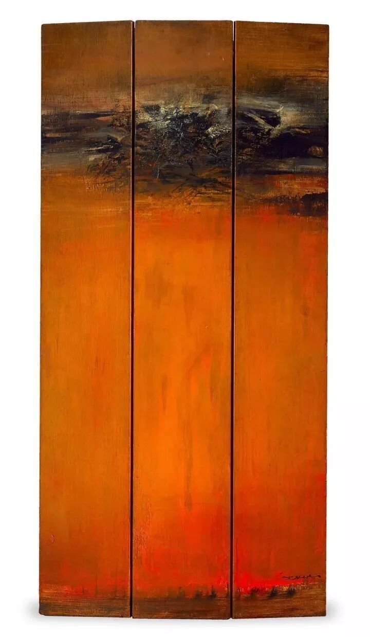 创作这件作品时,赵无极已然走出了前妻谢景兰离开他的阴霾,其与1958年在香港相识,进而相恋的电影明星陈美琴结为连理,他曾说:「我一见她就爱上她了,她姣好的五官,带着一种既娇柔又忧悒的气质,强烈的吸引我,我说服她辞去工作跟我去巴黎,我觉得只要两个人相爱,一切都不是问题。」美琴是赵无极一生的挚爱,爱情的润泽,也体现在这1960年代初期所创作的《16.04.62》中。在此,于三块直幅的木板上,艺术家以宽大的平笔层层刷染出一个以橘黄色为基底的世界,那色彩浓淡渐变的富丽天地,宛如日出的红霞,照耀、温暖着大地,也标示着他的美好生活。