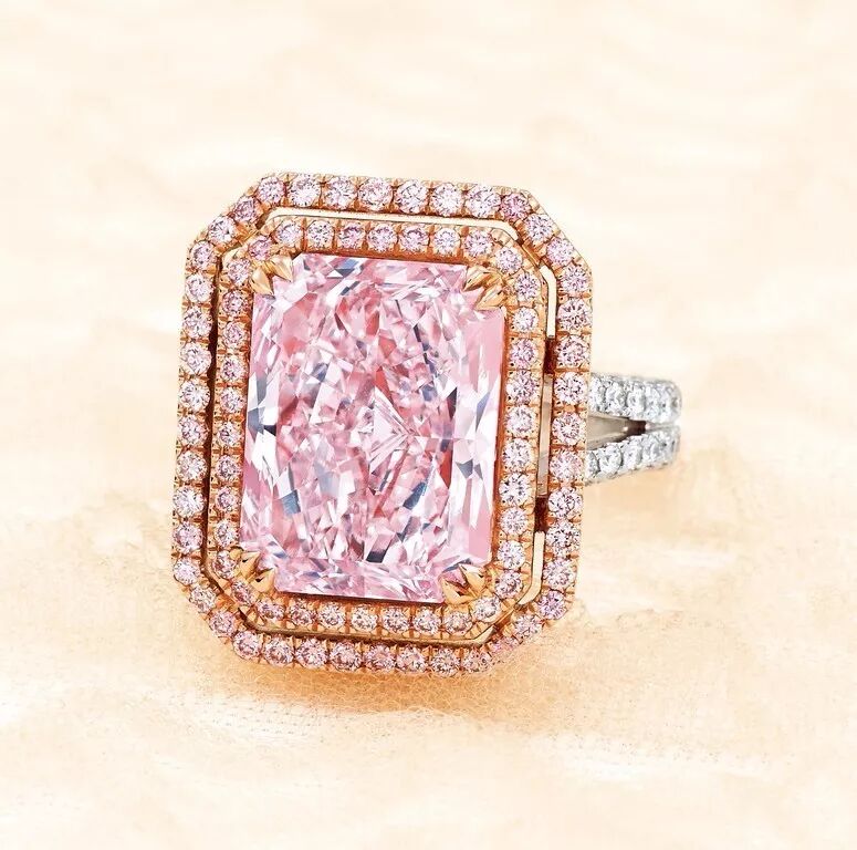 超过一克拉的天然粉色钻石极为罕见。在天然彩色钻石那有如万花筒般丰富的色彩中,粉红色备受宝石鉴赏家追捧。此枚7.62克拉天然彩紫粉红色VVS2净度钻石,配粉红色钻石及钻石戒指,永恒的设计不但完美地呈现了紫粉红色的浓郁色彩,还充分地展现出女性的优雅之美。硕大的戒面,极高的净度和工艺复杂的切割,都使其闪耀着无尽的光芒。