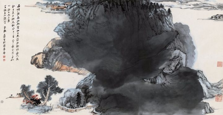 图中,大千以自天空向下的鸟瞰式构图,水墨勾出缓坡屋舍、树木扁舟,墨笔,复以泼墨铺陈大山,居于正中画面,以水墨的浓淡干湿变化标示山体的阴阳向背。山隙、枯石、莽树用墨稍重,与淡墨泼就的山体相互映衬,再以石青、赭石泼染,局部以较细笔法收拾,行笔运墨颇有古意,彰显出大千深厚的传统功力。